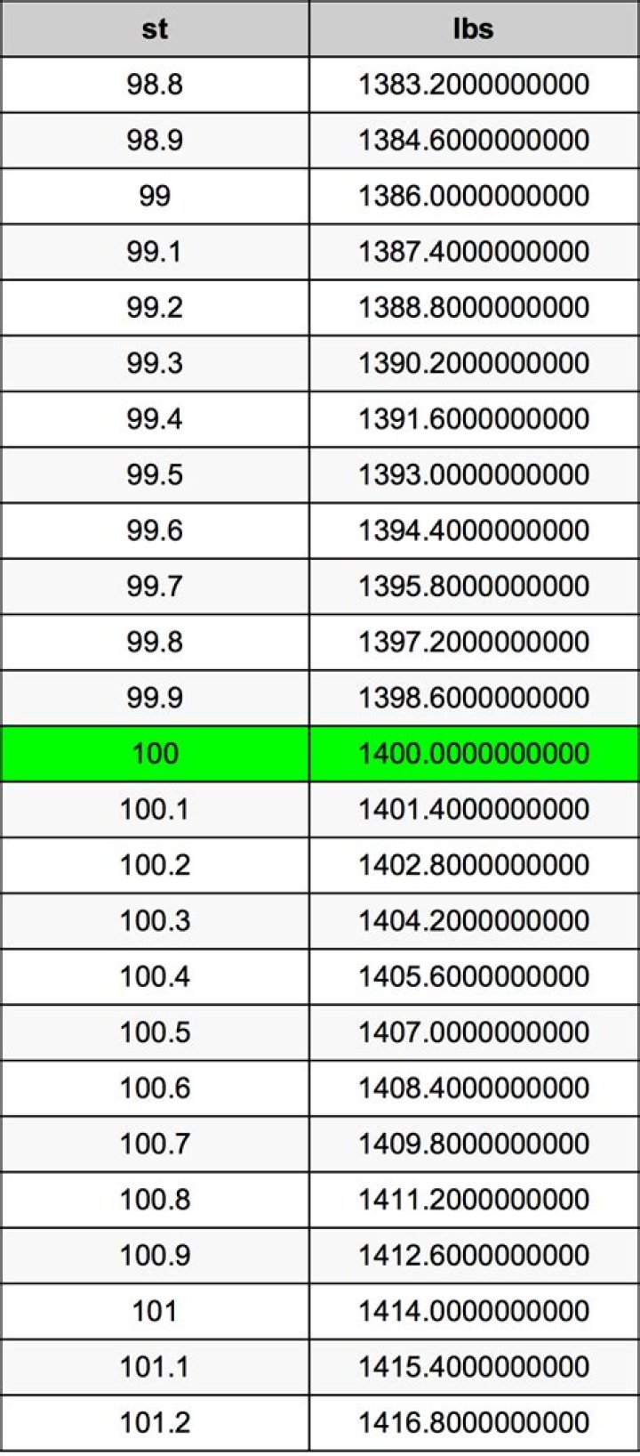 100 stones equal 1400.0 pounds (100st = 1400.0lbs). Converting 100 st to lb is easy. Simply use our calculator above, or apply the formula to change the length 100 st to lbs.