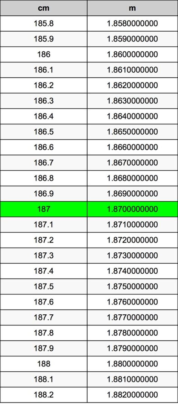 What is 187 centimeters in m?