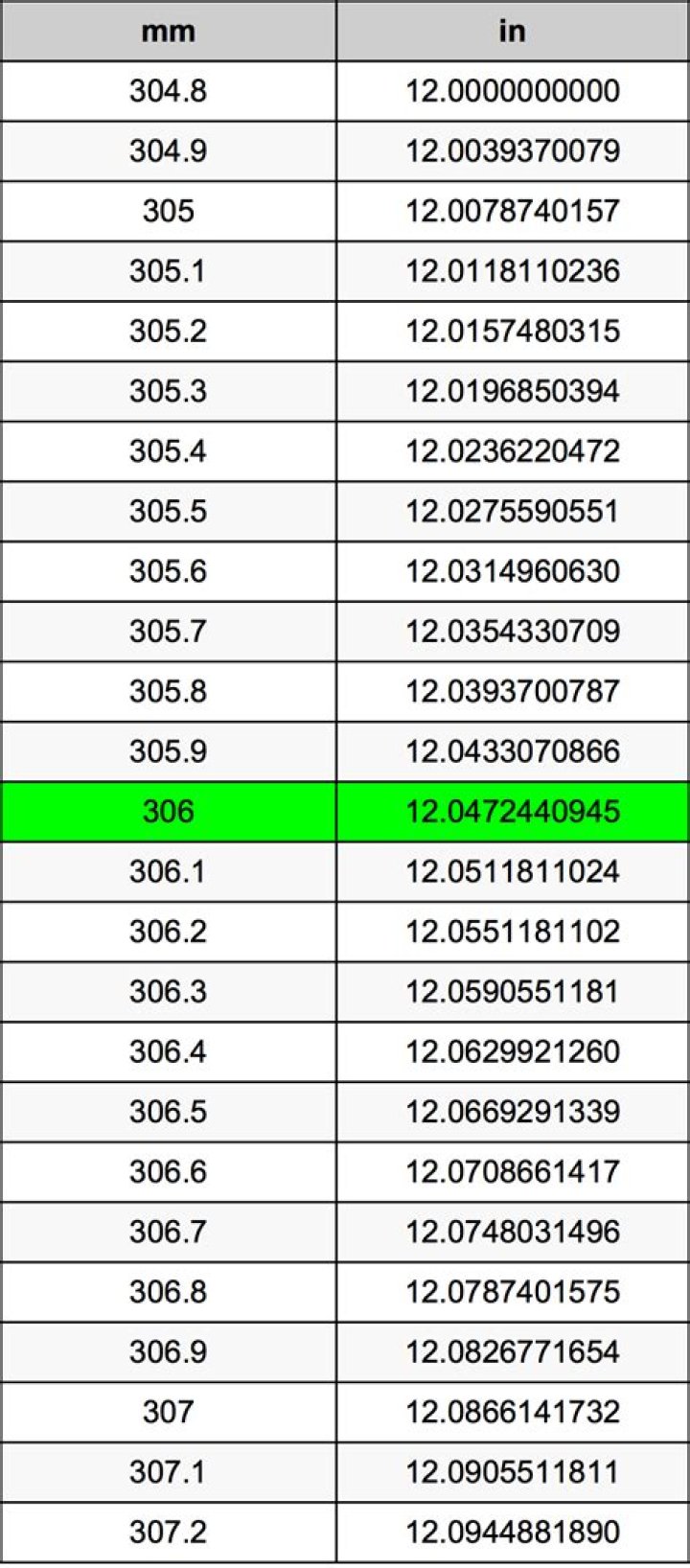 How much are 306 millimeters in inches?