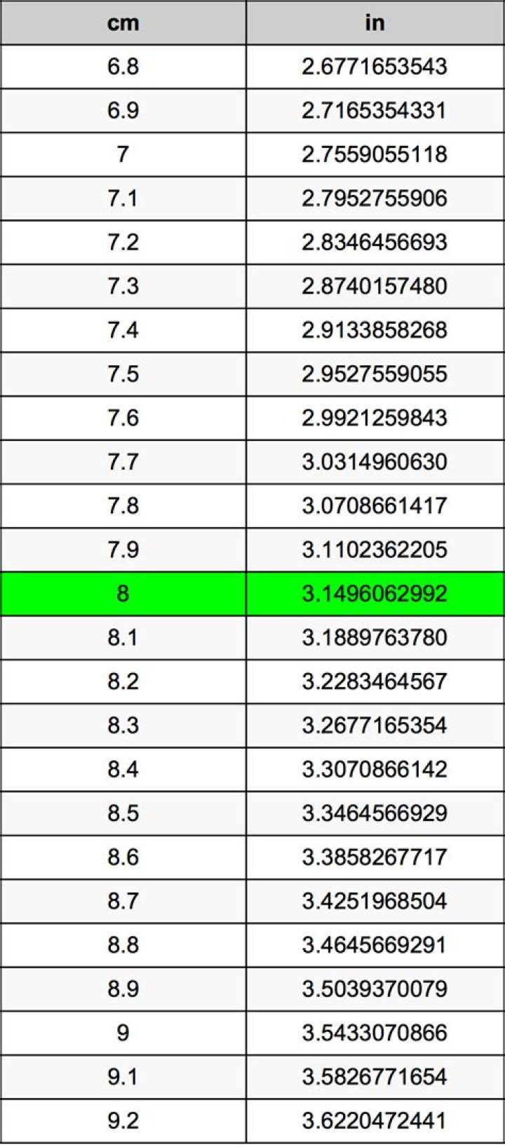 A common question is How many centimeter in 8 inch? And the answer is 20.32 cm in 8 in. Likewise the question how many inch in 8 centimeter has the answer of 3.1496062992 in in 8 cm.
