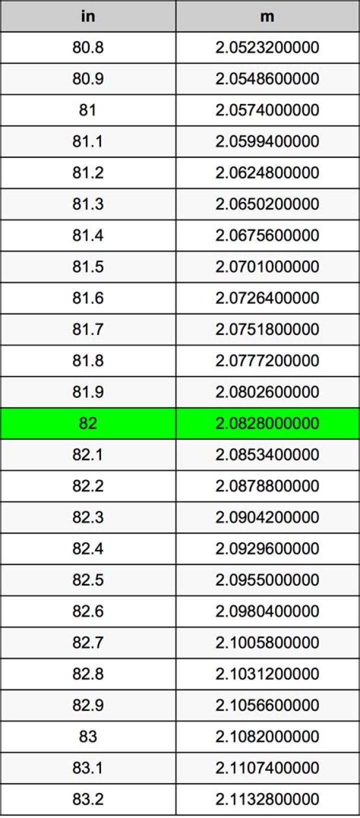 | 82 in * | 0.0254 m | = 2.0828 m |