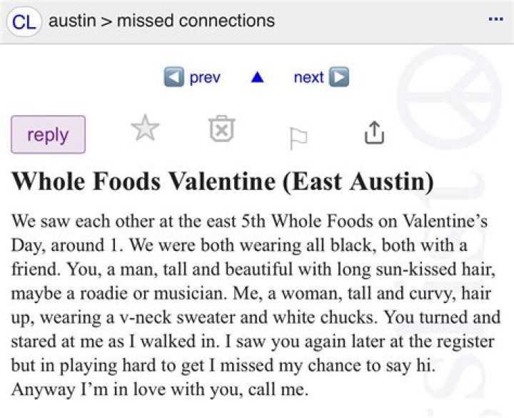 Austin Missed Connections is an online forum where people in the Austin, Texas area can post about missed opportunities to connect with someone they crossed paths with in a public setting, such as a coffee shop, bookstore, or music venue. The forum has been around for over 20 years and has helped countless people reconnect with strangers they felt a connection with but didn't get the chance to exchange contact information.